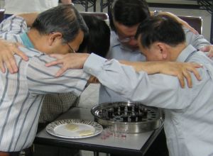 Four Japanese pastors praying together at communion