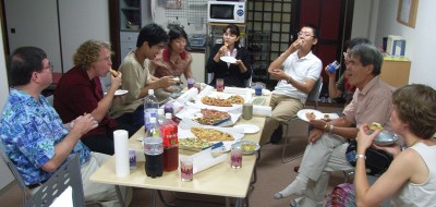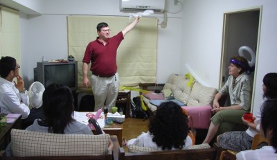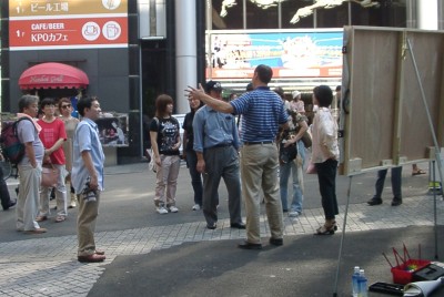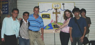 The days were hot, but the nights were cooler. Paul Adams, an "art evangelist" with Open Air Campaigners, visited us in Osaka, and together we spent a bit more than a week taking the gospel to the streets. The plan was simple: Paul presented a mini-workshop on evangelism at each of the small groups and then we hit the streets to give the small group members some open air evangelism experience. Paul painted Bible stories, riddles, and more while speaking to the people who stopped to watch. Dan and some of the other folks interpreted into Japanese, and everyone got a chance to speak with people one on one, and to pass out evangelistic tracts and tapes. It was not easy work - most Japanese kept walking, and those who did stop often walked away once they realized that it was a Christian presentation. But some stopped and listened and a few got in long conversations about the gospel and had a chance to hear the Good News of Jesus in some detail. Hearts were touched and some people expressed interest in learning more. But perhaps the biggest benefit was that many people in the church got a renewed vision for evangelism and a new sense of the urgent need to share the gospel with others. Paul left us a sketch board and some paints and brushes, and a few people in the church have expressed interest in taking to the streets more in the future.
