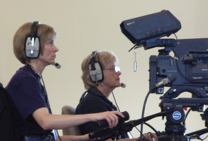 Karen and her dad on his 80th. Karen on a camera at Saddleback Church